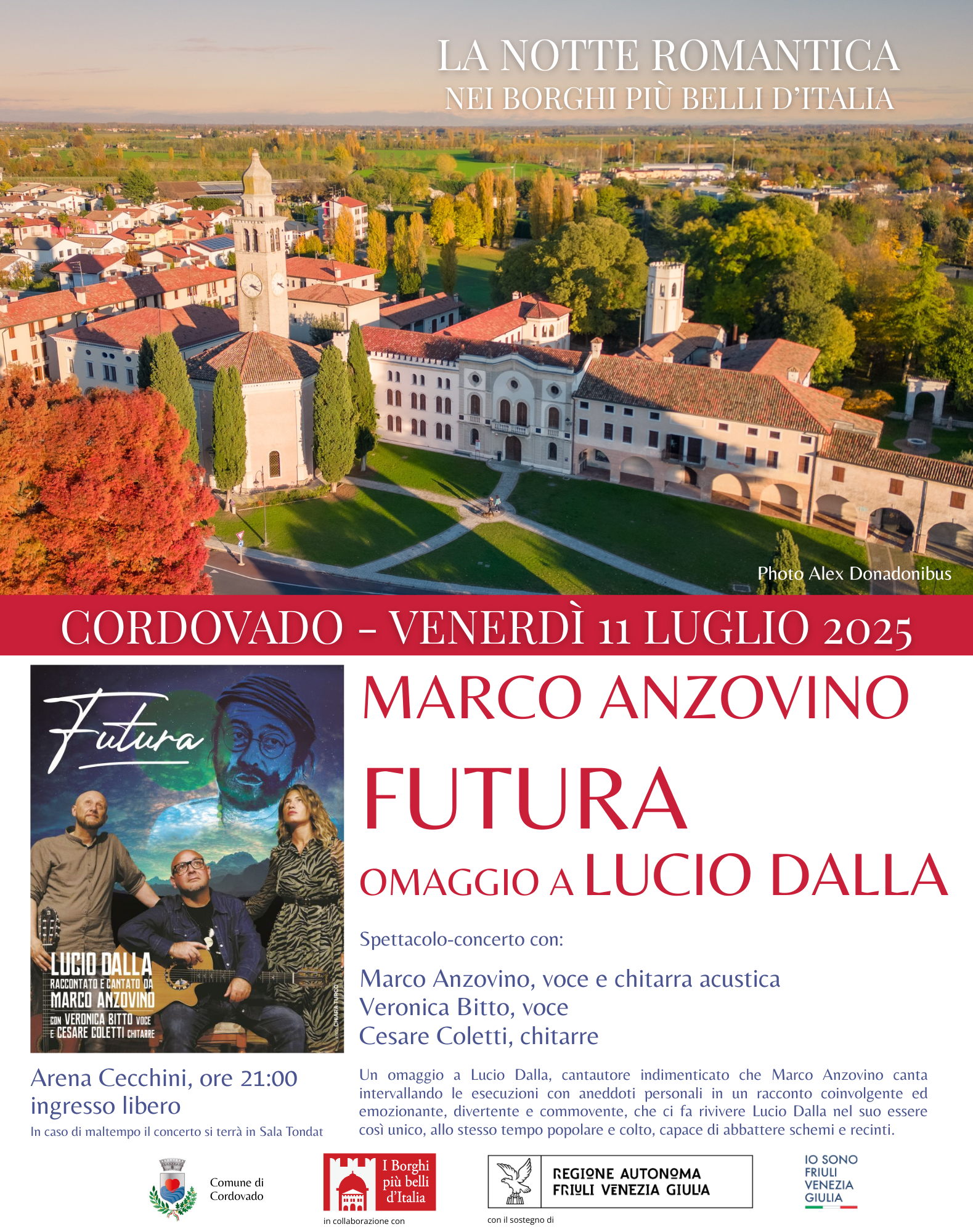 In occasione della Notte Romantica nei Borghi più Belli d’Italia, Cordovado accende le emozioni con un evento speciale, tra musica e poesia: “Futura – Omaggio a Lucio Dalla”, lo spettacolo-concerto di Marco Anzovino, insieme a Veronica Bitto (voce) e Cesare Coletti (chitarre).