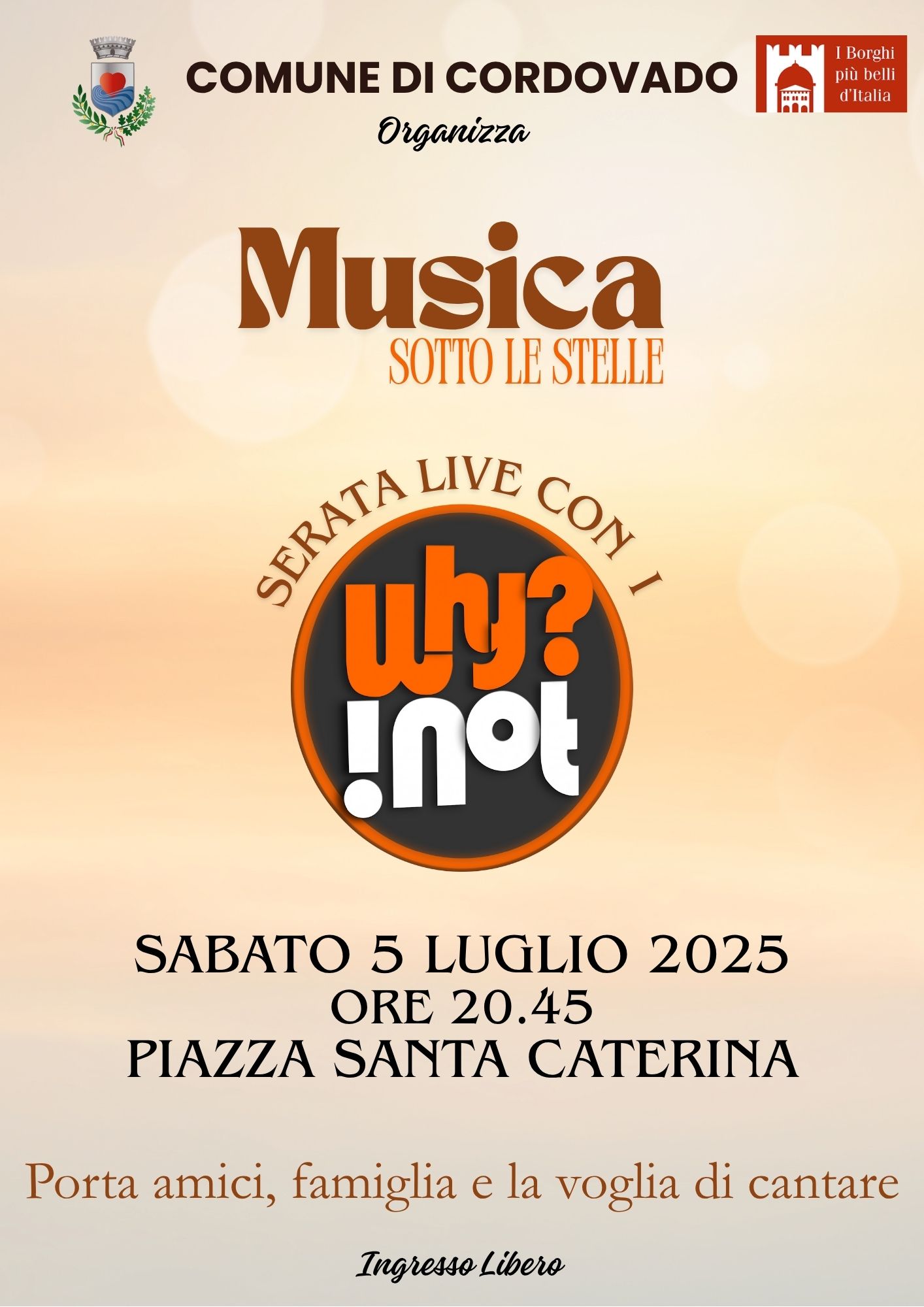 Sabato 5 luglio 2025, a partire dalle ore 20.45, Piazza Santa Caterina si accenderà con l’energia travolgente dei Why Not, gruppo musicale protagonista del concerto live organizzato dall’Amministrazione Comunale.